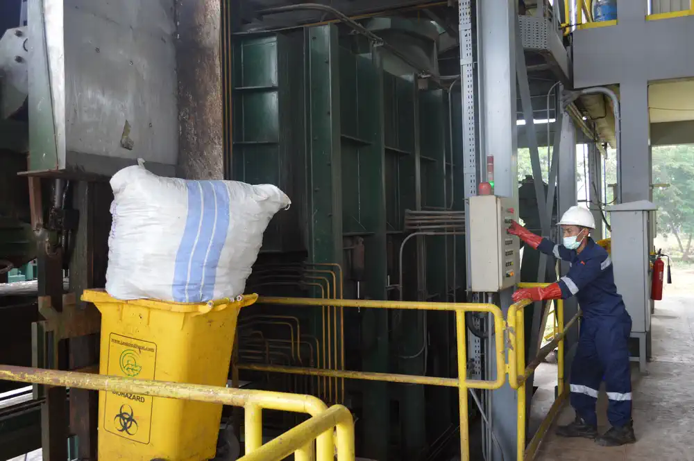 Pengolahan limbah menggunakan mesin incinerator yang ramah lingkungan dan hemat energi.